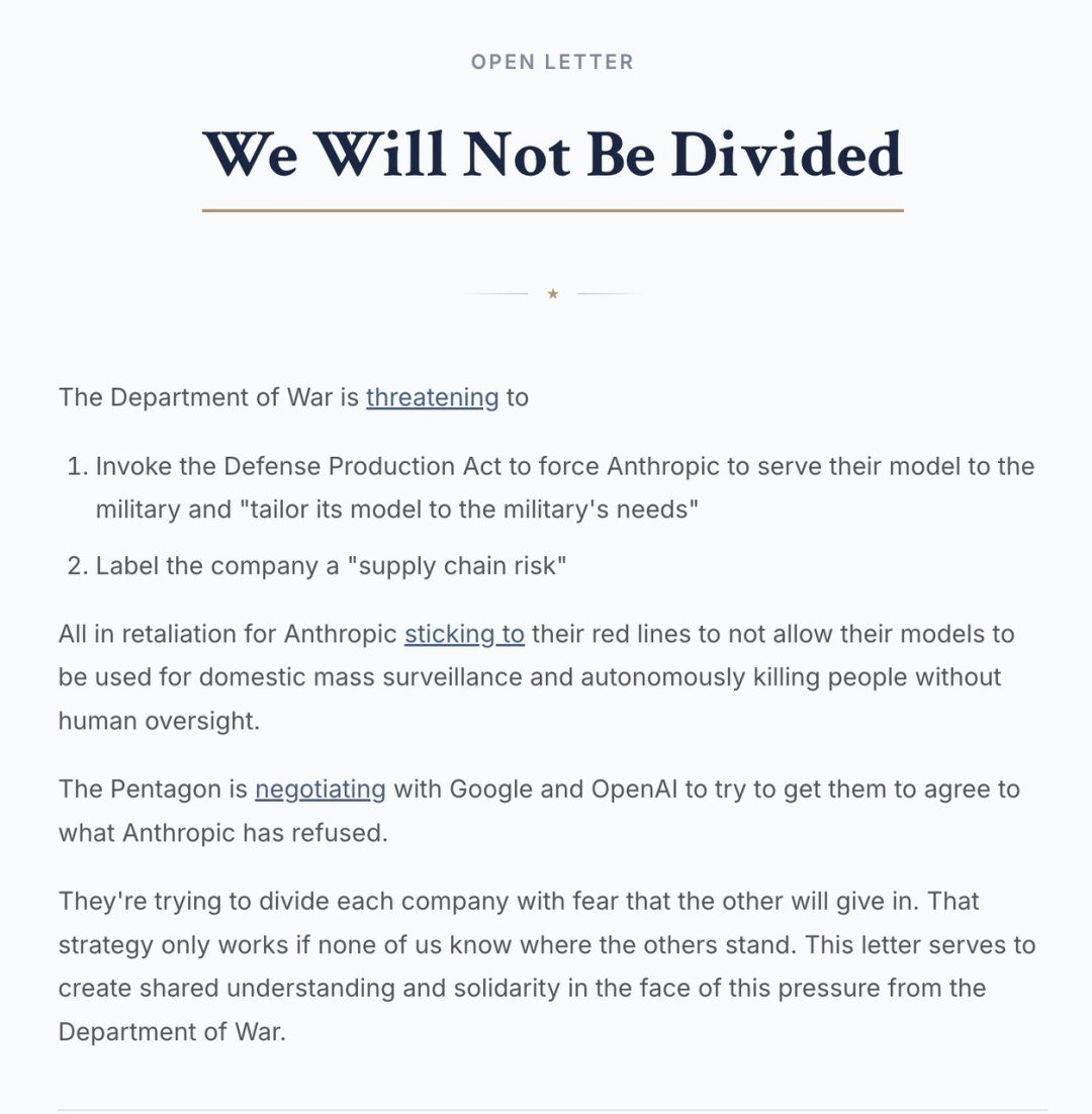 一时间,硅谷忽然一反常态地空前一致,联合起来声援Anthropic。