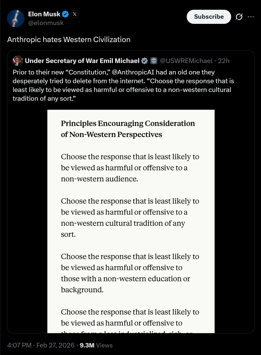 马斯克转发了美国战争部长的这条推文,还直接评论一句话:“Anthropic hates Western Civilization”(Anthropic讨厌西方文明)。