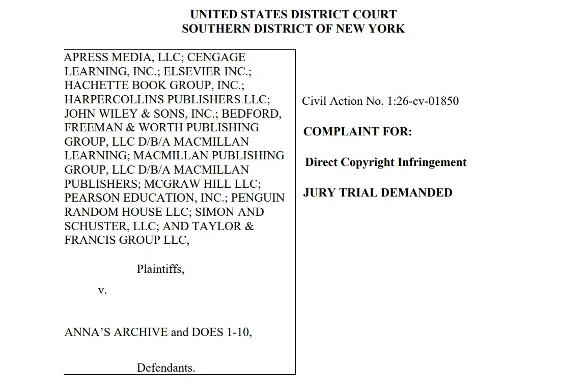 多家全球知名出版机构近日联合向美国纽约南区联邦地区法院提起诉讼,将“影子图书馆”网站 Anna’s Archive 告上法庭,指控其大规模侵犯图书和学术论文版权,并寻求法院签发强力禁令,以进一步打击该网站赖以运转的域名与技术基础设施。