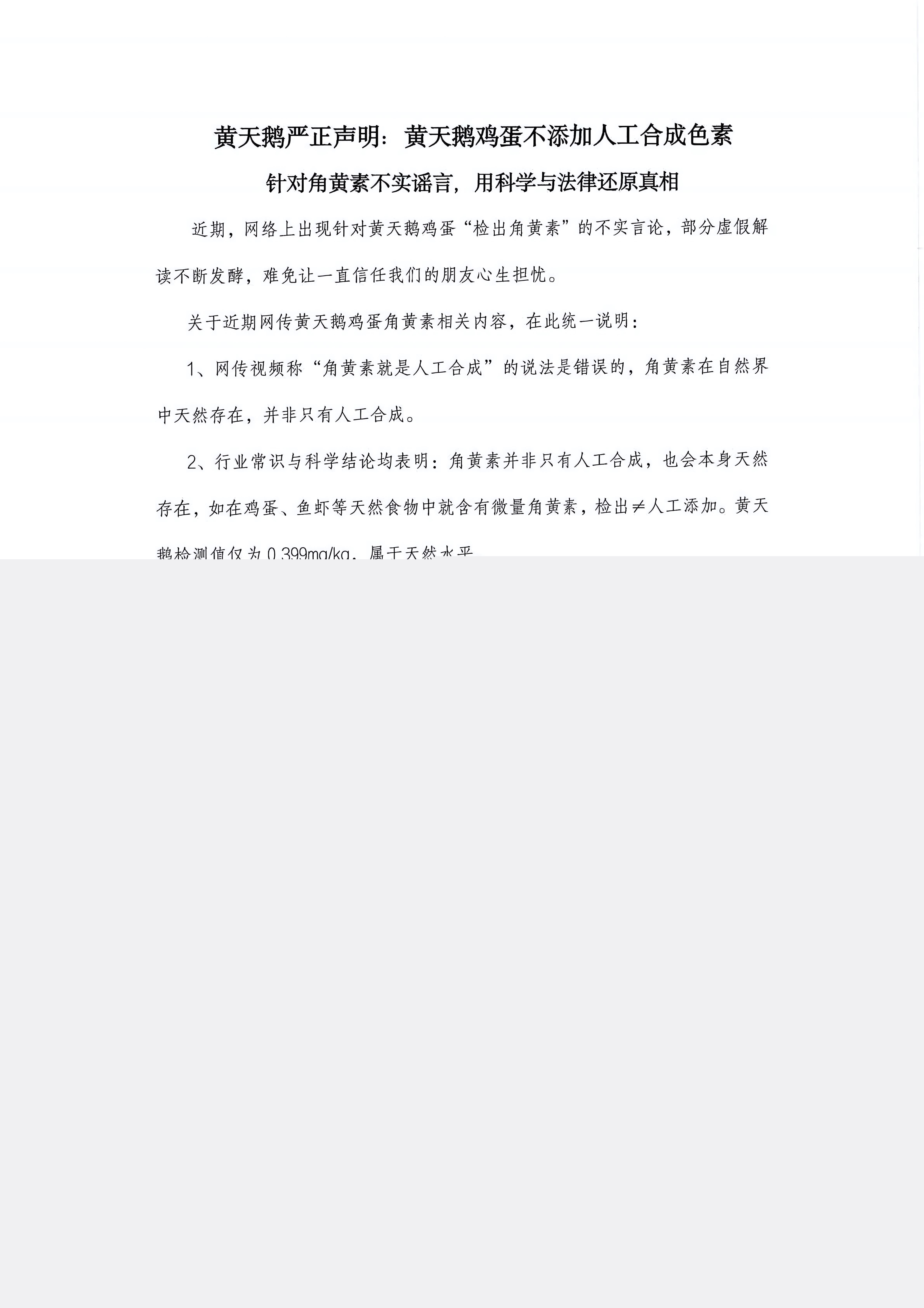 声明强调,此次检出的角黄素含量极低,仅为0.399mg/kg,远低于其他对比数值。黄天鹅坚称,该数值完全属于鸡蛋可能含有的天然本底水平,并非后期在饲料中人为添加的结果。