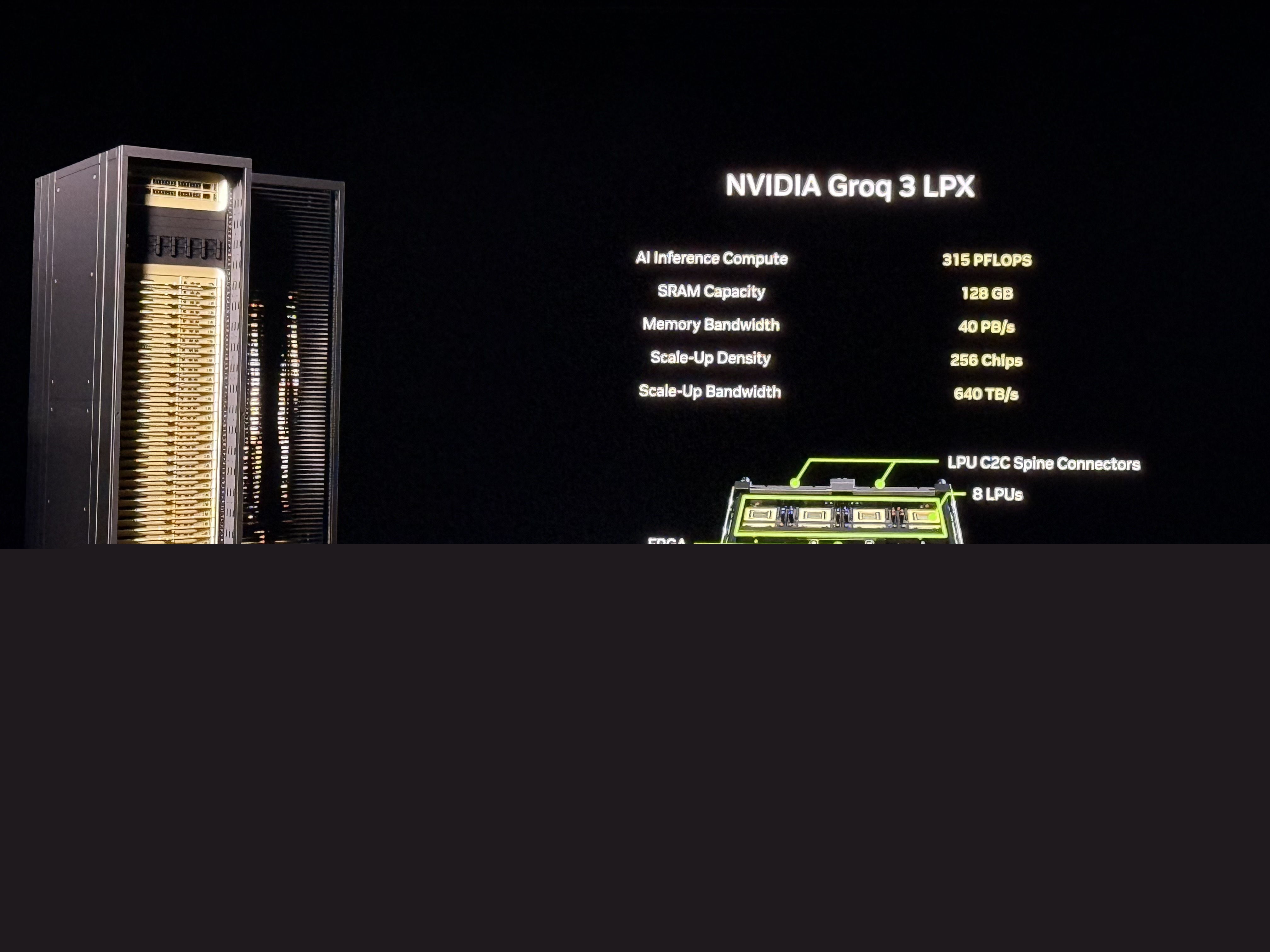 基于此,NVIDIA打造了Groq 3 LPX机架,包括256颗Groq 3 LPU,缓存总容量达128GB SRAM,带宽则是可怕的40PB/s。