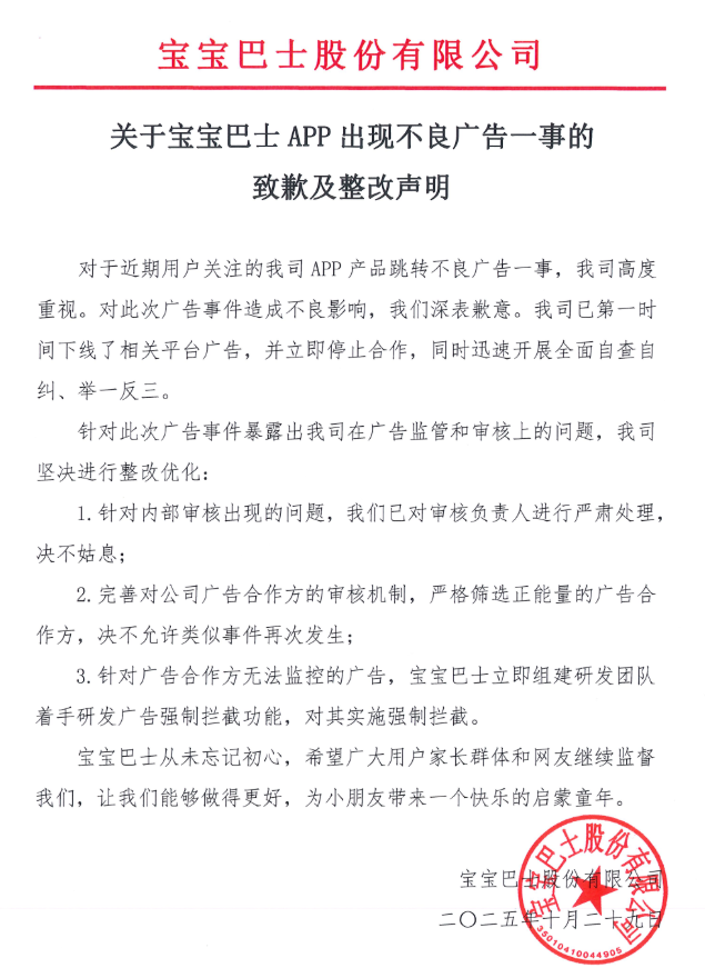 去年10月,有网友反映称,宝宝巴士App进入后会跳出成人广告,点击广告后会出现擦边视频,引发家长担忧。随后,宝宝巴士发布声明:针对内部审核出现的问题,公司已对审核负责人进行严肃处理,决不姑息;完善对公司广告合作方的审核机制,严格筛选正能量的广告合作方,决不允许类似事件再次发生;针对广告合作方无法监控的广告,宝宝巴士立即组建研发团队着手研发广告强制拦截功能,对其实施强制拦截。