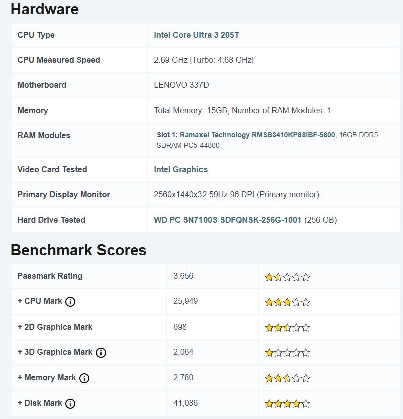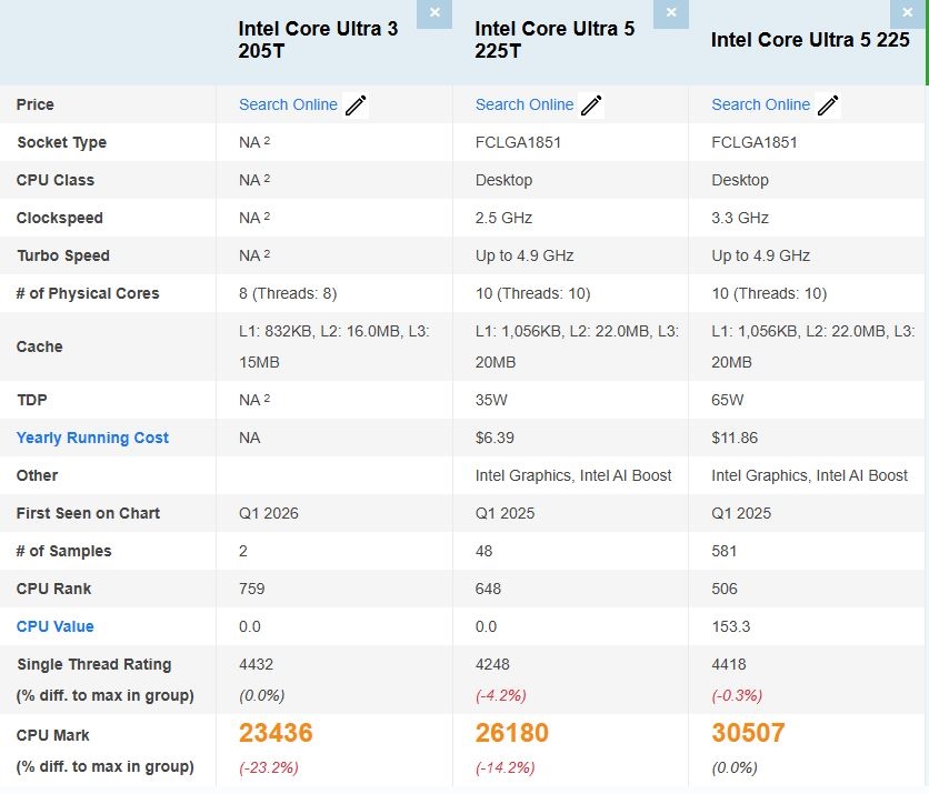 Intel最低端Arrow Lake首次现身 酷睿Ultra 3 205T单核表现竟超225T