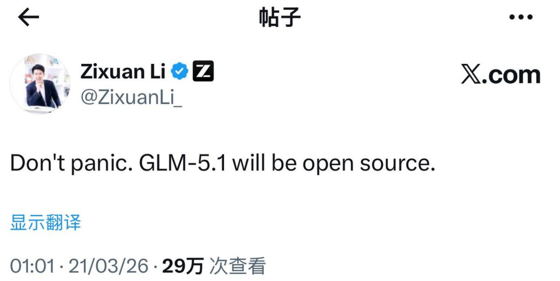 针对这个问题,智谱全球负责人李子玄在推上发文做了回应,表示Don't panic. GLM-5.1 will be open source.(别慌,GLM-5.1将会开源。)
