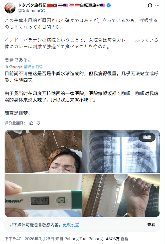 日前,日本旅行博主Dotabata旅行记在印度恒河岸边遭遇恶意袭击,因拒绝当地少年乞讨,被泼满身牛粪水球,引发高烧与呼吸困难,不得不紧急住院治疗。当地时间本月26日,博主与同伴在印度瓦拉纳西恒河沿岸散步时,遭3名当地少年围堵索要20卢比(约1.5元人民币),二人明确拒绝后转身离开。