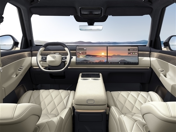 该车配备双辐式多功能方向盘,采用怀档设计,拥有15.6英寸超高清中控主副驾双联屏,同时还提供21.4英寸后排可折叠吸顶大屏,全车氛围灯总长度达12.8米,采用四层环舱式布局,并结合漫反射光学处理技术,光线均匀铺展。