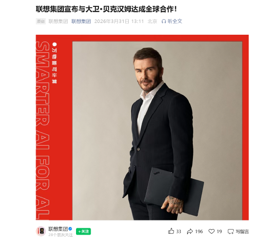 联想集团官宣与大卫·贝克汉姆达成全球合作。其还将现身联想集团于五月推出的全球营销活动,该活动将于2026年FIFA世界杯开赛前一个月正式上线。