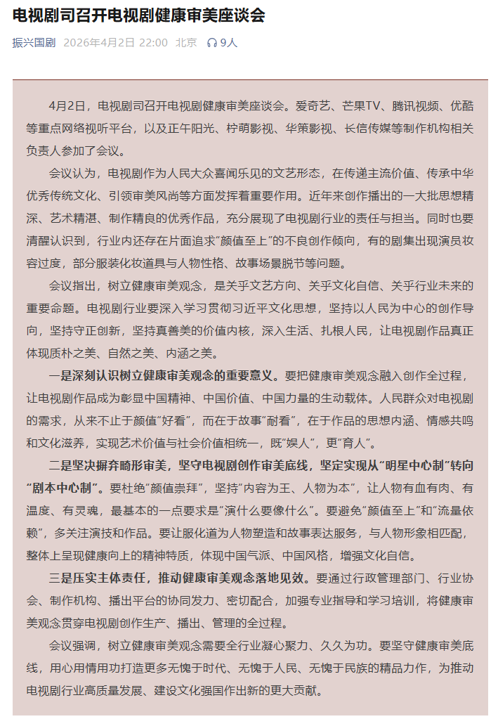 近期,某部热播古装剧引发热议,更是造就了“粉底液将军”这一畸形的名词。昨晚,国家广播电视总局电视剧行业动态和优秀电视剧片宣传展播账号“振兴国剧”发布题为《电视剧司召开电视剧健康审美座谈会》的文章,系统总结了当日座谈会的会议精神。