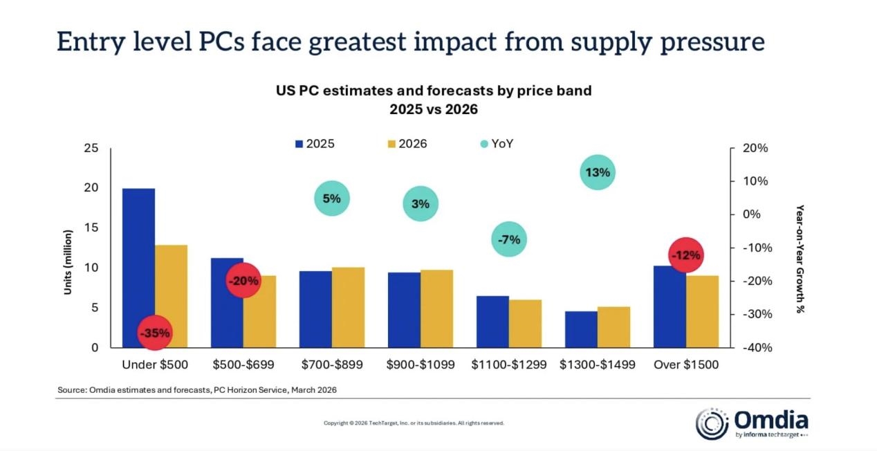 Omdia在报告中表示,当前的供应约束对500美元以下价位段冲击最大,该区间涵盖了大部分教育用途和入门消费级设备。