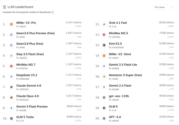 实际上在OpenClaw风靡全球的同时,几家国产AI大模型的使用量也在突飞猛进,最近2个多月长期霸榜OpenRouter的用量榜,MiniMax 2,5/2.7一度还是榜首,截至发稿时依然维持在调用量的TOP5。
