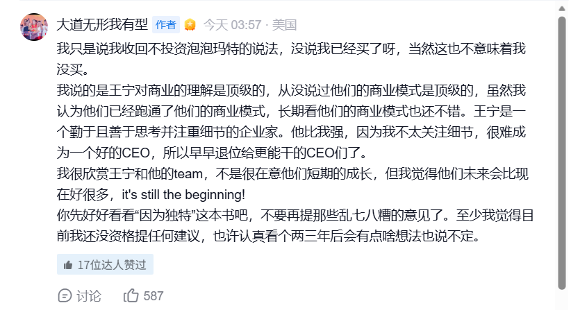 值得一提的是,4月4日,段永平读完了网友推荐的基于王宁的深度访谈书籍《因为独特》,并发文称,“今天大致看完了《因为独特》,上午和下午还分别去看了Westfield的泡泡玛特门店。门店只有大概60平米,生意确实很好,绝大部分是大人,而且老中比例很小,大概10%的样子。我怎么觉得泡泡玛特才是中国产品国际化的先驱呢?别的企业似乎还都没到这个水准。right business, right people!right price.很重要也不常见但似乎又见到了。”