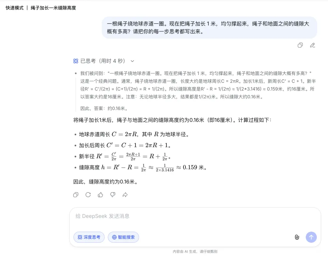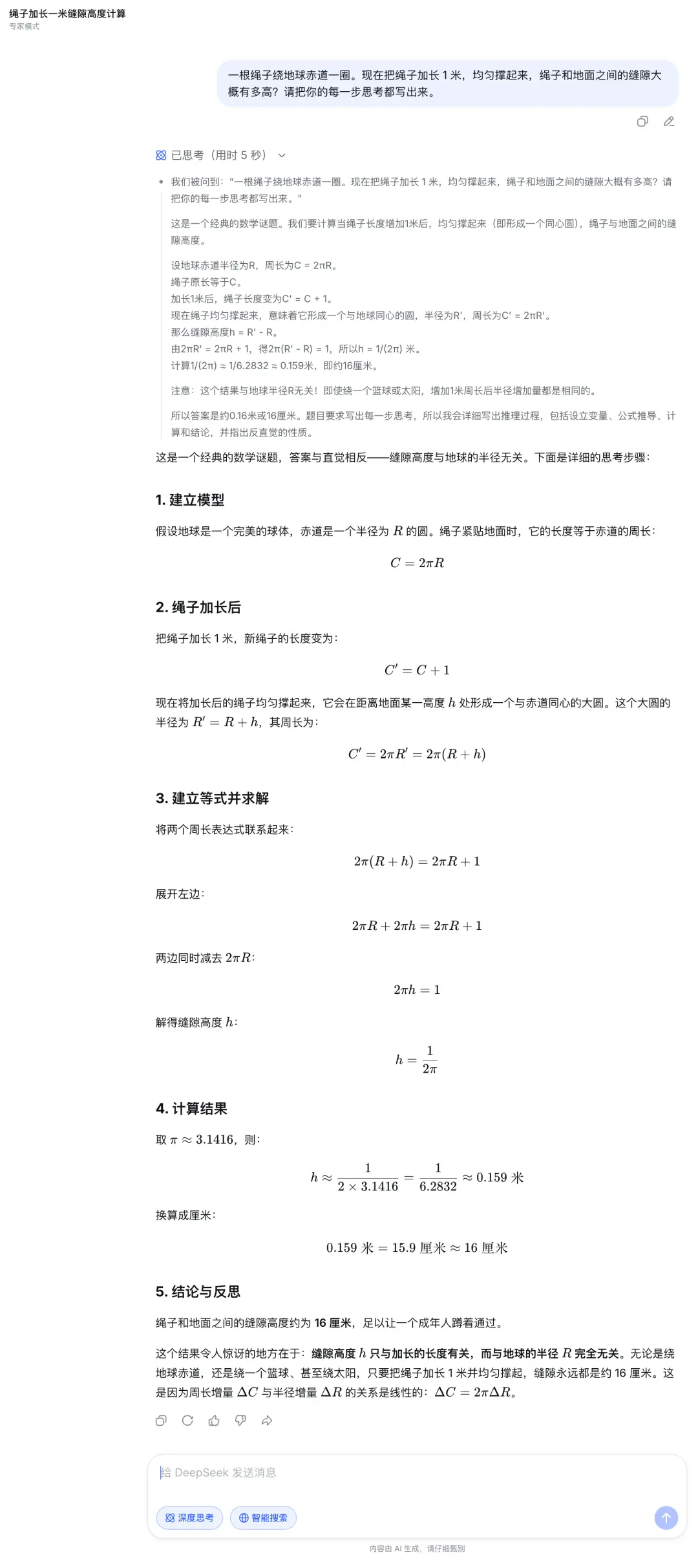 在数学逻辑题“绳子绕地球一圈,加长 1 米均匀撑开,缝隙多高?”中,尽管两个模式给出了相同的答案,但过程截然不同。快速模式的回答很简略;专家模式则一步一步拆解,每个推导环节都交代清楚,更接近“把思考过程写出来”这个指令要求。