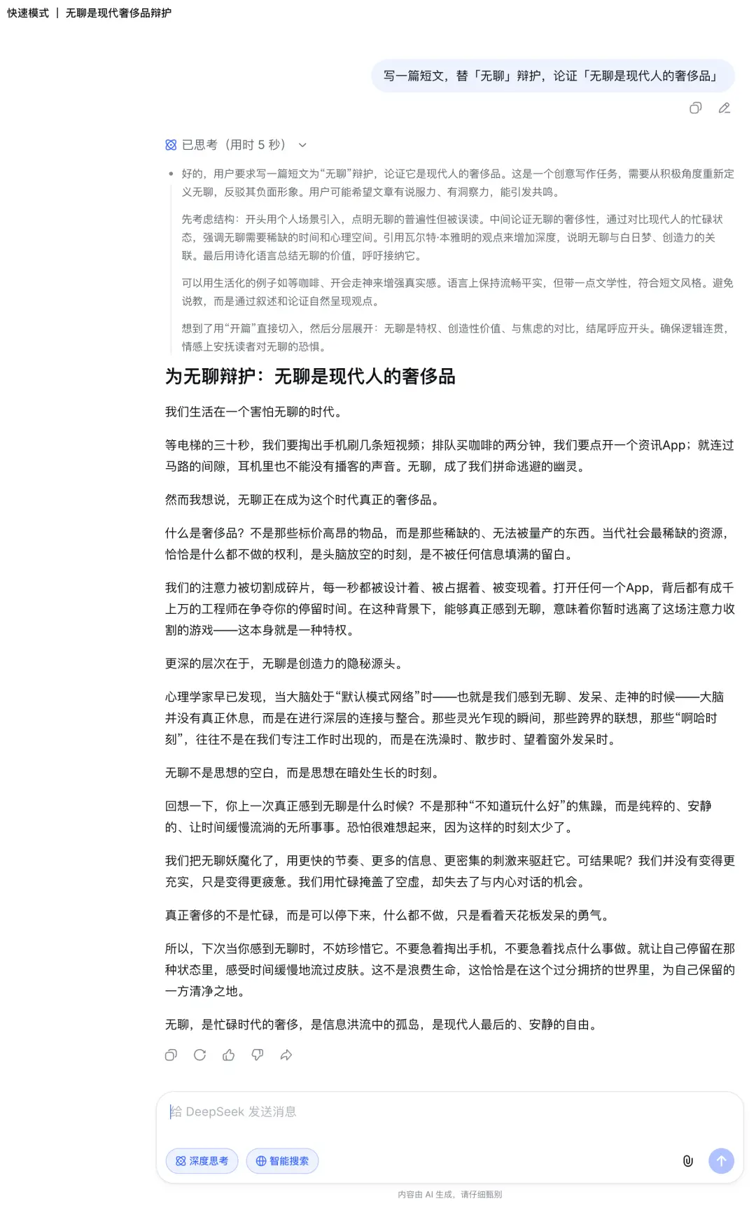 创意写作方面,我给两种模式出了一道辩论写作题,题目是“替无聊辩护,论证无聊是现代人的奢侈品”。