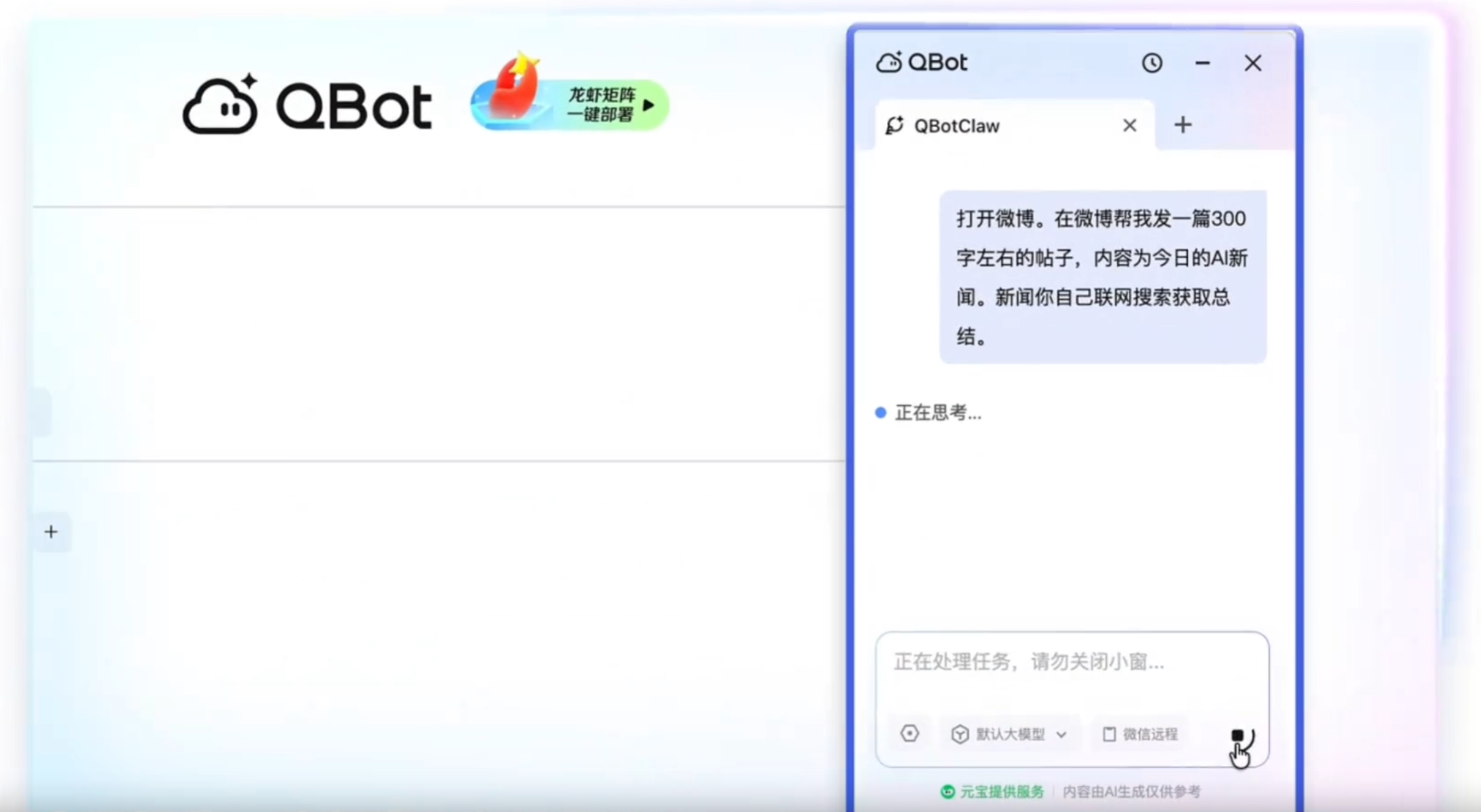 不仅如此,QBotClaw还能帮用户发帖,只需一句指令:把当前文档的内容配上图,发一条微博,它就会自动帮你点开网页、填入内容、点击发布。