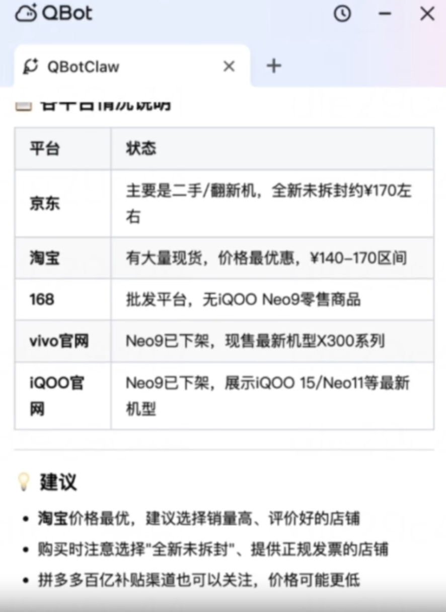 现在,只需在侧边栏向QBotClaw发出一句指令,例如“帮我对比这几款手机价格”,它便可自动跨页面抓取数据,并输出清晰的比价结果及购买建议。