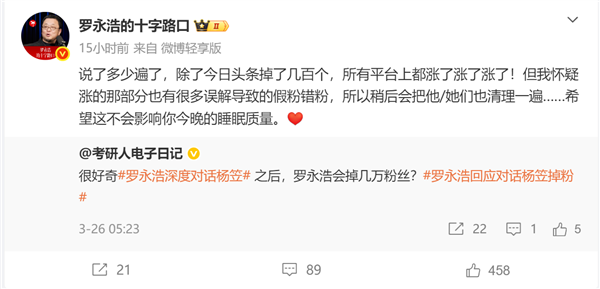 他还提到,后续会清理掉因为误解而关注的粉丝,并不在意所谓的流量波动。