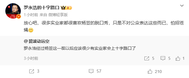 罗永浩在微博再次谈及与杨笠对话引发的争议,他直言很多实业家都很喜欢杨笠的脱口秀,只是不对公众表达这些而已,怕招苍蝇。