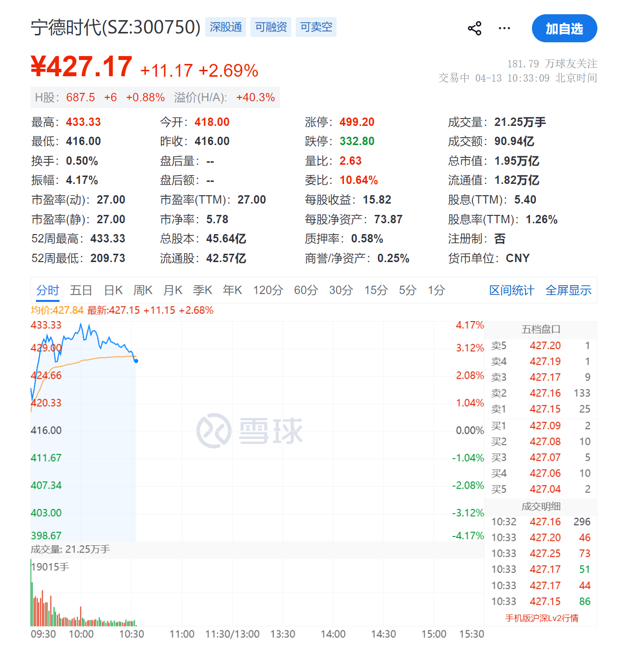 宁德时代A股今日盘中涨超4%,最高股价433.33元/股,刷新历史新高。此外,宁德时代H股盘中也涨超2%,A+H股总市值一度突破2万亿。
