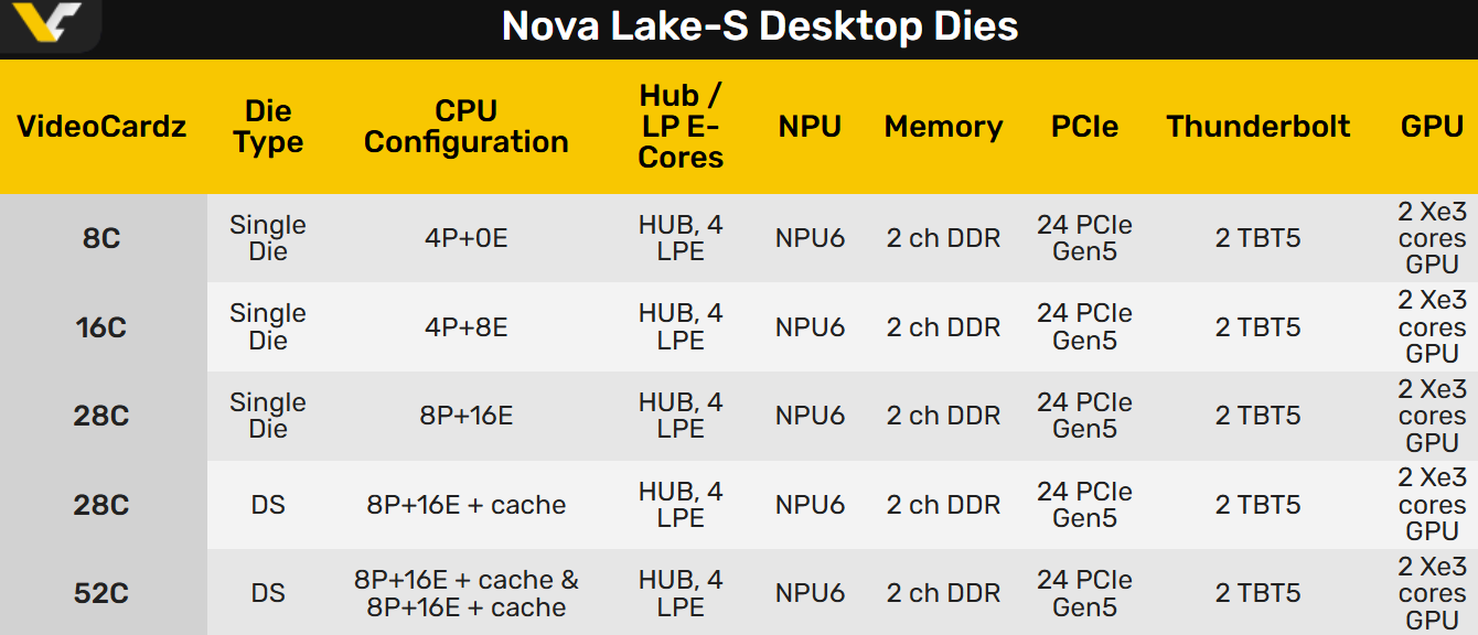 回到CPU上,Intel一共规划了五种不同的封装,全部标配4个LPE低功耗核心、NPU 6、24条PCIe 5.0、两个雷电5、两个Xe3核心GPU核显。
