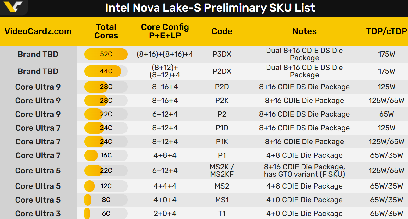 具体SKU型号暂时规划了13款,不但横跨酷睿Ultra 3/5/7/9四大系列,最高端的52/44核心极有可能归入酷睿X系列(或者酷睿Ultra X系列),也就是发烧级平台回归,175W功耗的就是它俩。