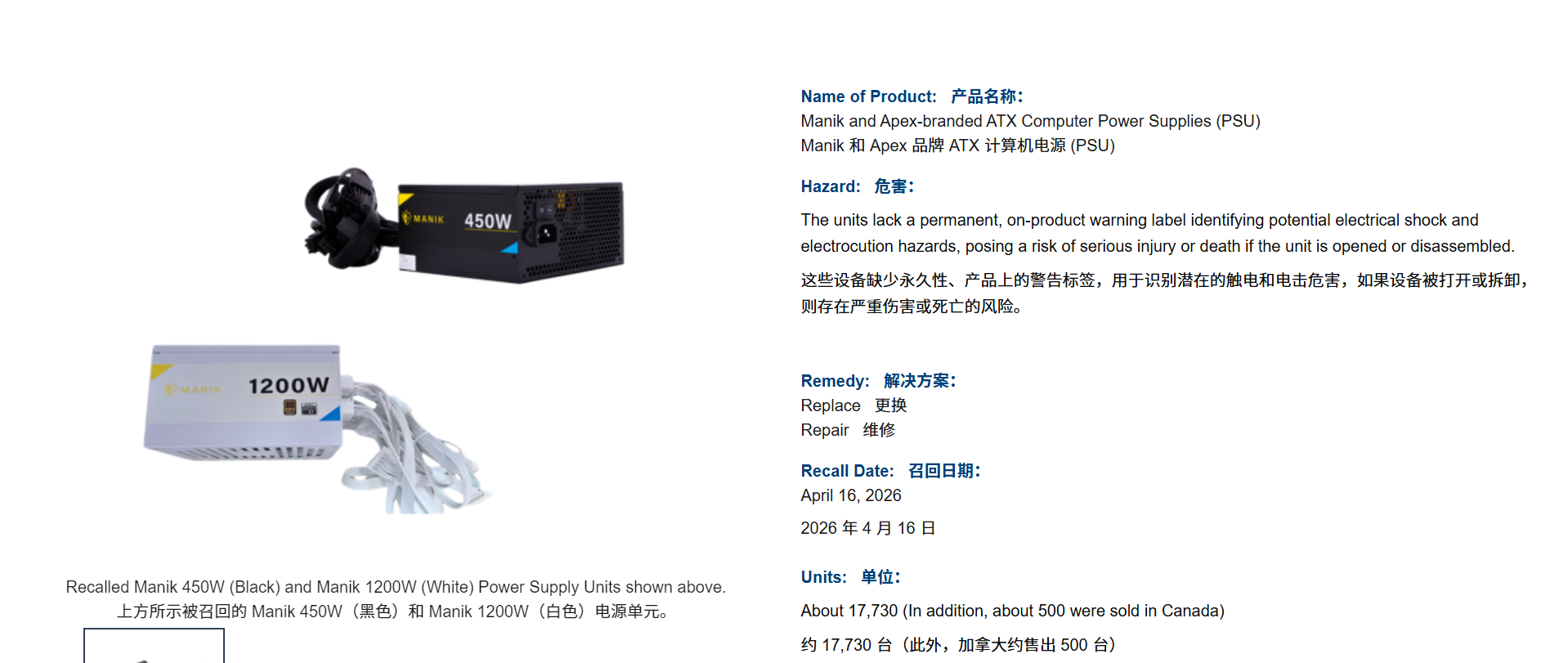 美国消费品安全委员会(CPSC)于4月16日发布紧急安全召回通知,Apex Gaming召回旗下Apex及Manik品牌共计1.8万只PC电源供应器,原因是产品存在导致死亡或重伤的风险,呼吁用户立即停用。