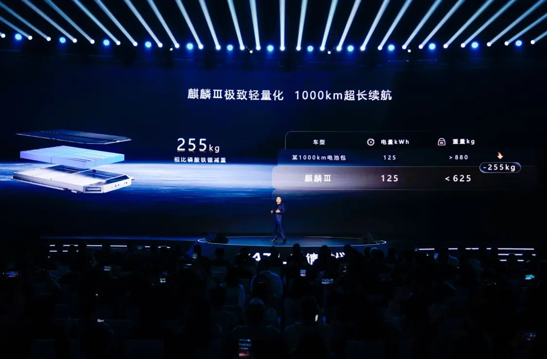 麒麟凝聚态电池电芯能量密度350Wh/kg,体积能量密度760Wh/L,为量产电池最高纪录。轿车续航可达1500公里,全尺寸SUV续航超1000公里,电池包重量控制在650公斤以内。该技术此前已在4吨级商用飞机完成首飞验证,即将在8吨以上商用飞机验证。电解质为凝聚态,实现“无液可漏、无液可燃”。