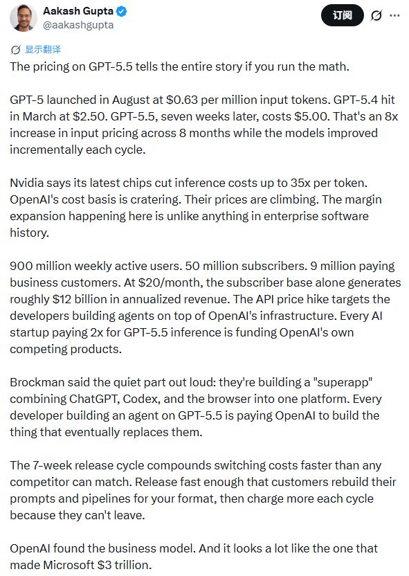 AI产品专家阿卡什·古普塔(Aakash Gupta)分析了这个定价轨迹。从去年8月GPT-5的0.63美元到今年3月GPT-5.4的2.50美元,再到七周后GPT-5.5的5美元,八个月内输入定价涨了八倍。而英伟达表示其最新芯片将推理成本降低了高达每token 35倍。