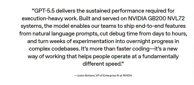 英伟达企业AI副总裁贾斯汀·博伊塔诺(Justin Boitano)评价说,GPT-5.5提供了执行繁重工作所需的持续性能。基于英伟达GB200 NVL72系统构建和服务的这个模型,让团队能够从自然语言提示中交付端到端的功能,将调试时间从数天缩短到数小时,并将数周的实验转化为在复杂代码库中的一夜进展。他认为这不仅仅是更快的编码,而是一种全新的工作方式。