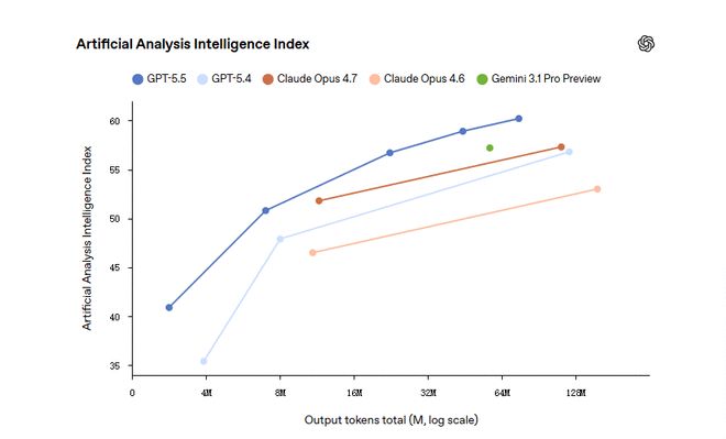 比分数更值得注意的,是GPT-5.5达成这些分数的方式。它用的输出token数量大幅减少。简单说就是它找到答案的路径更短了。