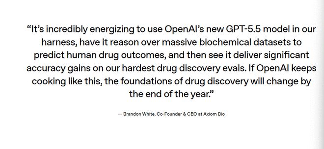 Axiom Bio的联合创始人兼CEO布兰登·怀特(Brandon White)则从药物发现的角度给出了判断。他让GPT-5.5推理庞大的生物化学数据集以预测人类药物结果,然后看到它在最难的评估中带来了显著的准确性提升。他的判断是,如果OpenAI继续保持这样的势头,药物发现的基础将在年底前发生改变。