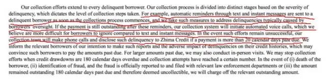 2017年,趣店上市时,招股书就已经明晃晃地写着,趣店会通过发短信和自动打语音电话的方式催收,如果催收没有效果,趣店就会人工打电话给借款人,必要时还会上门当面收款。