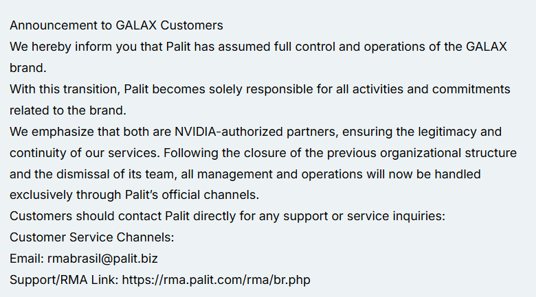 随着原组织架构的关闭和团队的解散,所有管理和运营工作将完全通过Palit(同德)的官方渠道进行。购买了GALAX显卡的客户仍可享受保修/RMA服务。如有任何支持或服务方面的疑问,请直接联系Palit(同德)。”