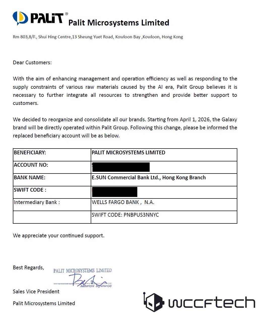 我们决定对所有品牌进行重组和整合。自2026年4月1日起,GALAX品牌将直接由 Palit(同德)集团负责运营。”