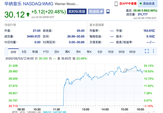 美国东部时间6月3日,华纳音乐登陆纳斯达克,定价25美元每股,交易规模从最初的7千万股增加到7.7千万股,是今年迄今为止最大的IPO活动,股票代码为“WMG”。上市首日股价上涨20%,这使华纳音乐的市值达到153亿美元。