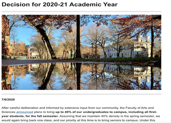 新浪财经对在哈佛大学求学的学生求证,收到的最新消息是:“秋季课程所有的教学都会在线上,目前学校只允许40%的本科生返校居住在校园内,而这个刚好是在ICE发通知几个小时前发布的。”根据哈佛大学公布的一则声明看来,学校希望“在春季学期保持40%的人口密度,这样可以带回一门课。”而为了限制在校人数,参加网课的国际生将不得不离开校园。包括哈佛医学院在内的六所哈佛大学的研究生院和专业学院也宣布他们的学生将在秋季上在线课程。