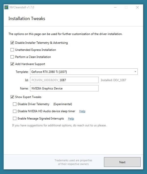 今天,NVCleanstall升级到了1.7.0版本,变化非常大,除了继续完善常规组件选择功能外,还加入了更强大的玩法,支持修改INF配置文件,从而能够在本来不支持的设备上安装驱动。
