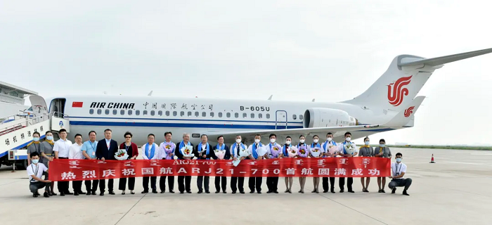 7月10日7时47分,国航全新引进的ARJ21-700新型涡扇支线客机执飞的CA1109航班从北京首都国际机场飞抵锡林浩特机场,成功完成首航任务,正式投入航线运营。首航航班起飞前在首都机场举行了简短而热烈的首航仪式,中航集团党组书记、董事长蔡剑江,中国商飞公司党委书记、董事长贺东风,国航副总裁柴维玺参加仪式,共同祝贺国航首架ARJ21飞机顺利首航。