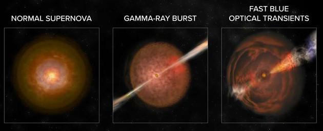 这些能量爆发极为猛烈、速度极快,以极高的速度将大量物质抛入太空之中。天文学家将这类爆炸事件命名为“快速蓝色视觉瞬态事件”,简称FBOT事件。