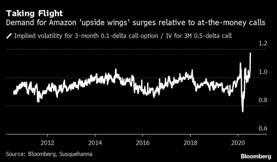 在欣欣向荣股市的表面之下所隐藏的动物精神之旺盛依然罕见。亚马逊的看涨合约获得历史性需求追捧,尽管它们到期获得回报的概率可能只有十分之一。尽管该公司今年股价已经上涨了66%,但交易员们正在买入的期权预测该股在接下来三个月中还将再上涨50%。