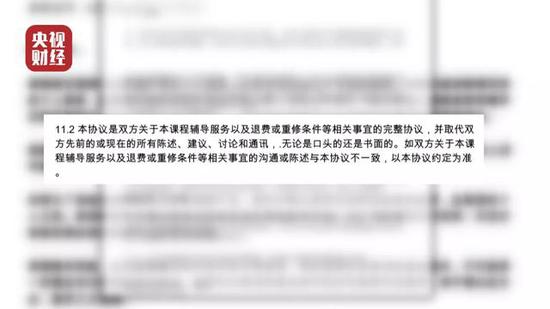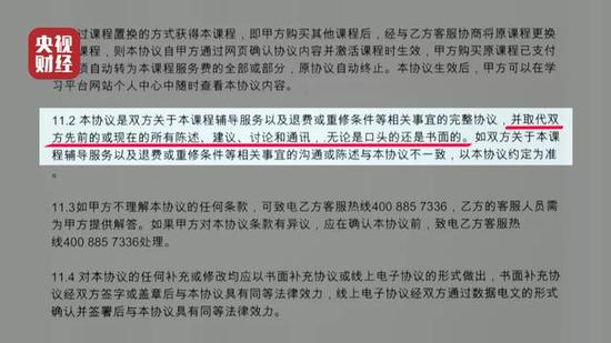 看到这样的规定,小唯傻了眼,也就是说,此前嗨学网销售的所有口头承诺,按照这个协议是不算数的。可是小唯清楚地记得,当初在激活课程时,都是销售在代为操作,她只是点了付款选项。