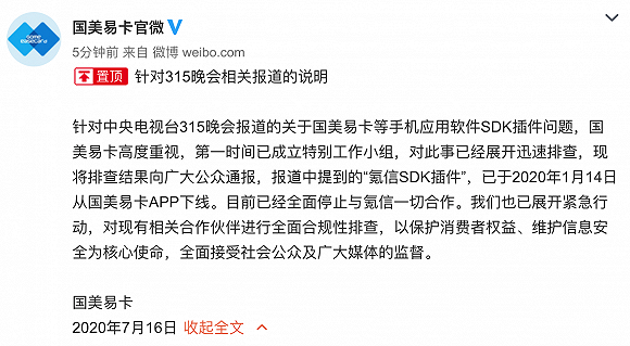 针对中央电视台315晚会报道的关于国美易卡等手机应用软件SDK插件问题,国美易卡高度重视,第一时间已成立特别工作小组,对此事已经展开迅速排查,现将排查结果向广大公众通报,报道中提到的“氪信SDK插件”,已于2020年1月14日从国美易卡App下线。目前已经全面停止与氪信一切合作。我们也已展开紧急行动,对现有相关合作伙伴进行全面合规性排查,以保护消费者权益、维护信息安全为核心使命,全面接受社会公众及广大媒体的监督。