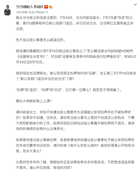 我从当当发出的信息注意到,7月14日,当当内部信显示,7月7日被“夺走”的公章、银行U盾等物件已被公安部门追回,并归还给当当,当当网已全面恢复正常运营。