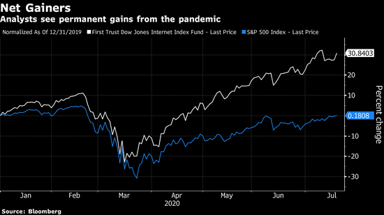 追踪互联网股票的交易所交易基金(ETF)--第一信托道琼斯互联网指数基金在2020年以来上涨超过30%。同期标普500指数上涨不到1%。