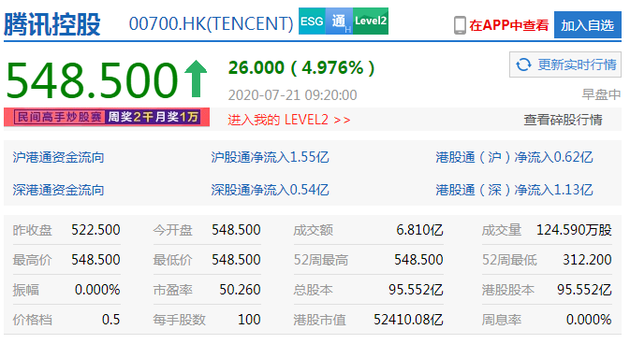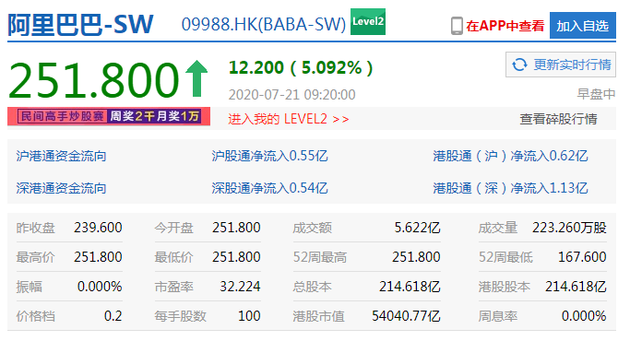 7月21日上午消息,港股开盘阿里巴巴、腾讯控股、小米集团、美团点评等科技股纷纷开张。阿里巴巴涨5.09%报251.80港元,腾讯控股涨4.97%报548.50港元,小米集团涨3.66%报16.40港元,美团点评涨2.97%报194.00港元。