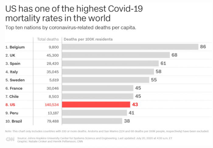 实际上,美国是新冠病毒死亡人数最多的国家之一。根据约翰斯-霍普金斯大学的数据,美国已经发现了近390万例冠状病毒病例,同时还有超过14万人死亡。根据CNN的报道,以下是美国的新冠死亡率。