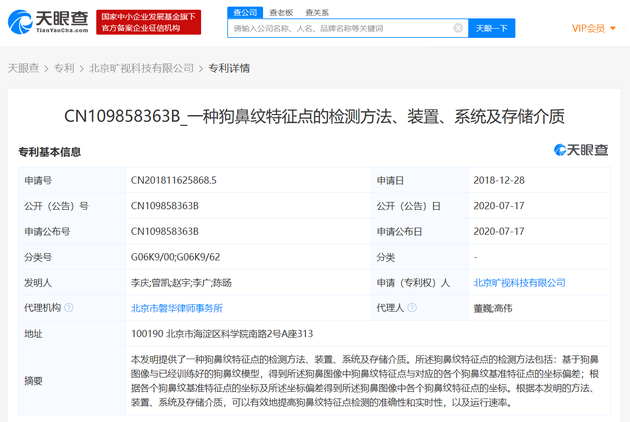 7月22日上午消息,天眼查数据显示,近日,北京旷视科技有限公司新增多条专利信息,其中之一为:一种狗鼻纹特征点的检测方法、装置、系统及存储介质。本专利申请于2018年12月,公布日在2020年7月。