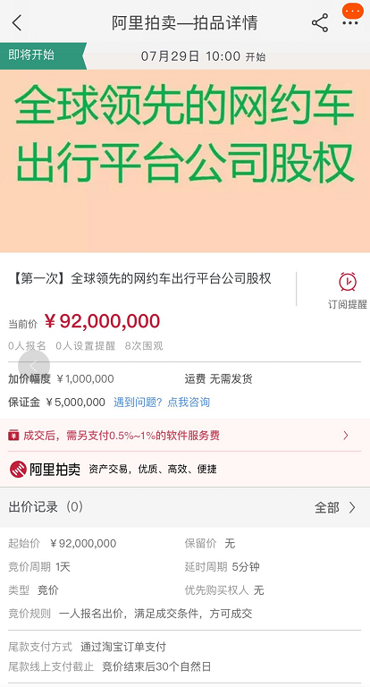 7月21日,有媒体从阿里拍卖方面获悉,某“全球领先的网约车出行平台公司”部分股权将于7月29日进行网络拍卖,起拍价9200万元。而从拍卖页面提供的标的公司经营数据来看,上述网约车平台为滴滴。