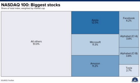 以纳斯达克100指数为例,领头的六支大型科技股——苹果、微软、亚马逊、Alphabet谷歌母公司、Facebook和特斯拉几乎占到了该指数市值的一半。标普500指数等其他大盘指数也都呈现了相同的现象和趋势,显示美股市场窄度持续降低。