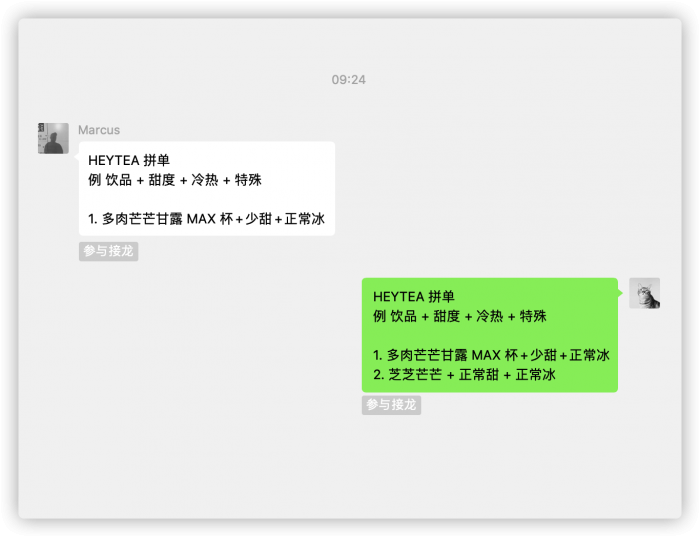 群内的任何人都可以发起“接龙”,但不同于引用、撤回等功能,接龙没有具体可视入口,只能通过在聊天框中输入“#接龙”或“#接龙 + 换行 + 数字”的形式激活,具体格式如下: