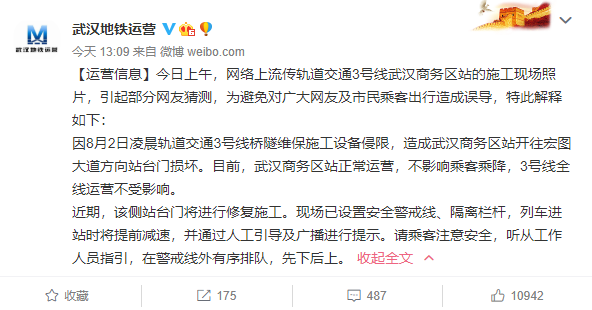 据悉,事情源于8月2日凌晨轨道交通3号线桥隧维保施工设备侵限,造成武汉商务区站开往宏图大道方向站台门损坏。目前,武汉商务区站正常运营,不影响乘客乘降,3号线全线运营不受影响。